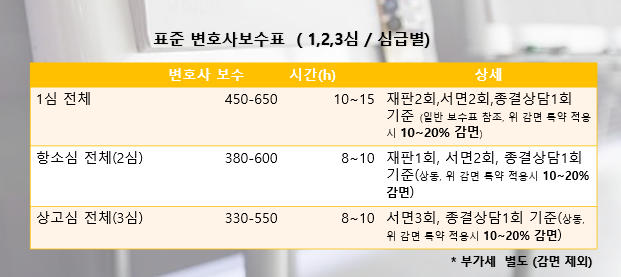 항소심(2심): 1심 결과를 뒤집거나 지켜내야 하는 치열한 단계입니다. 재판 1회와 서면 2회를 기본으로 삼백팔십만 원에서 육백만 원 수준의 수임료가 책정됩니다.