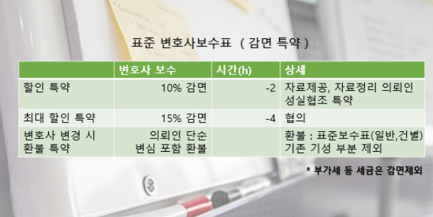 성실 협조, 자료 정리 후 제공 등 4시간 내외의 변호사업무시간을 보다 법리검토 등에 집중할 수 있게 해주시는 경우, 10% 감면 혜택을 드리며, 협의를 통해 최대 20%까지 보수를 할인받으실 수 있습니다. 자세한 것은 상담 시에 설명드리며, 현재까지 많은 의뢰인들께서 만족하고 있는 평택변호사비용 감면 방법입니다.